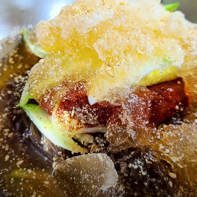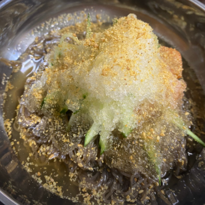 육수가 시원했고 약간의 다데기가 들어가 있는데 비빔냉면의 양념장과 같았어요.
