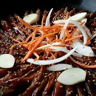 바짝 마른 빙어에 양념치킨 양념을 바른 맛 맥주랑 먹으면 맛있을것 같아요.