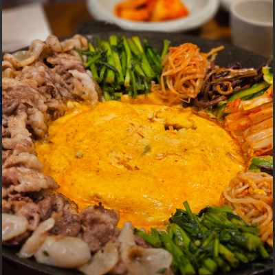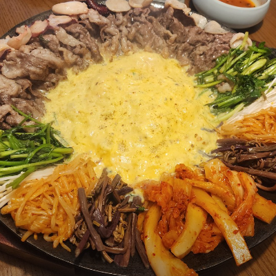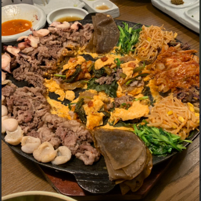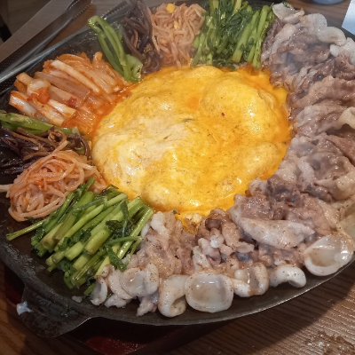 철판에 토치로 고기도 익혀주고 계란도 풀어서 토치로 익혀 야채,문어,관자,미나리,고사리등등 골고루 맛이 좋아요.