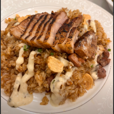 필라프는 김치가 들어있어 식감도 좋고 간이 쎄지 않아요. 수비드 삼겹스테이크가 올라가 있는데 부드럽고 야들야들하니 녹아요.