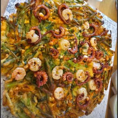 파전도 이게 무슨일인지 완전 빠삭빠삭하고 재료가 가득 들어 있어요. 낙지볶음소스에 찍어먹어도 간장에 찍어먹어도 맛이 좋아요.