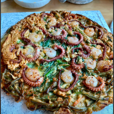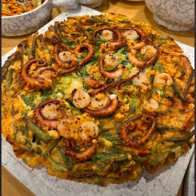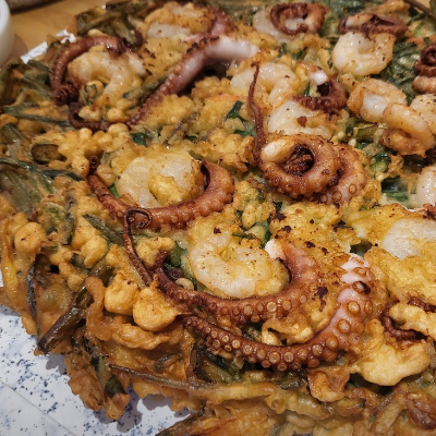 파전도 이게 무슨일인지 완전 빠삭빠삭하고 재료가 가득 들어 있어요. 낙지볶음소스에 찍어먹어도 간장에 찍어먹어도 맛이 좋아요.