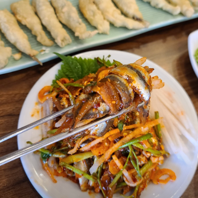 양도 푸짐하고 멸치쌈밥은 처음인데 너무 맛있게 먹었어요. 특히 튀김이랑 회무침이 진짜 맛있었어요.