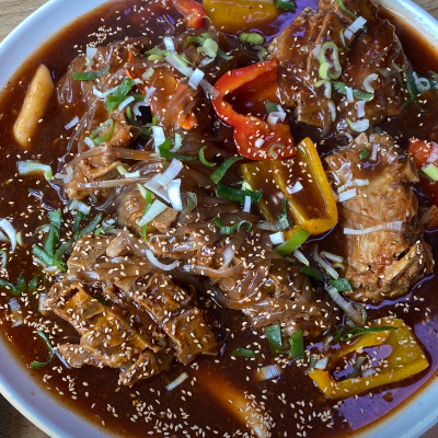 끓고 있는 국물은 칼칼하고 시원하며 자극적이지 않아요. 쫄깃하게 익은 당면부터 건져먹으면 됩니다.
