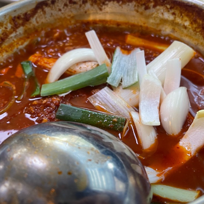 끓고 있는 국물은 칼칼하고 시원하며 자극적이지 않아요. 쫄깃하게 익은 당면부터 건져먹으면 됩니다.