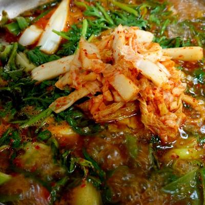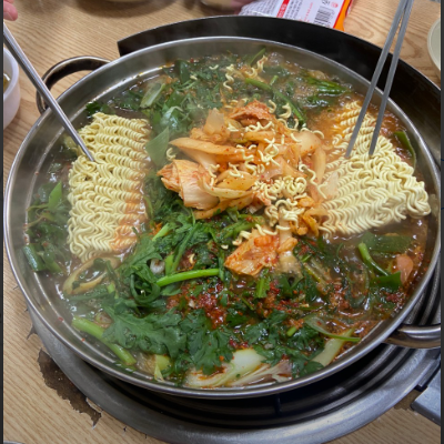 쑥갓이 많이 들어간 특이한 부대찌개이며 그만큼 국물이 매우 시원한 맛을 내고 있으며, 끓일수록 매우 진한 맛이 나서 좋았습니다.