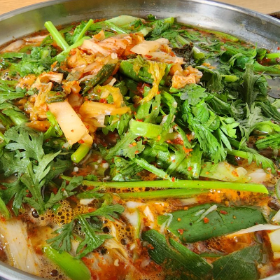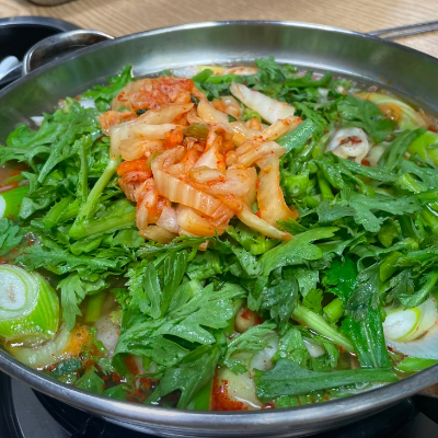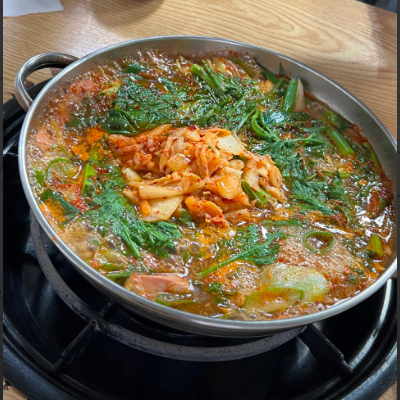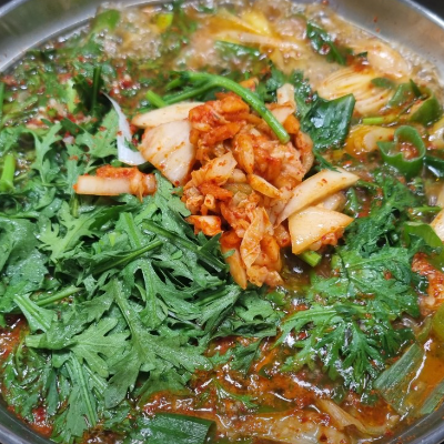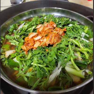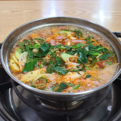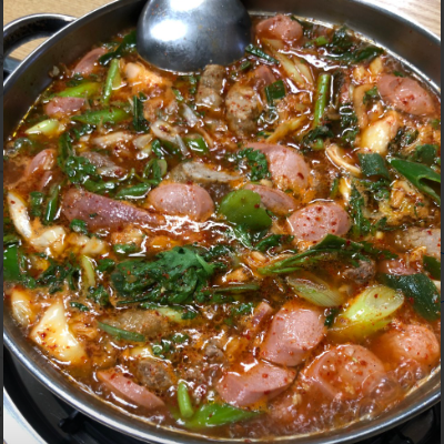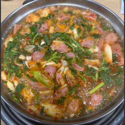 쑥갓이 많이 들어간 특이한 부대찌개이며 그만큼 국물이 매우 시원한 맛을 내고 있으며, 끓일수록 매우 진한 맛이 나서 좋았습니다.