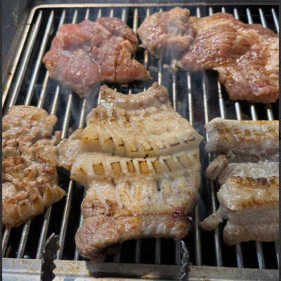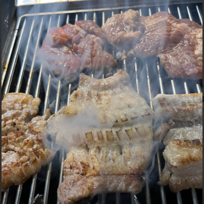 완전 캠핑갔을때 야외에서 먹는 고기맛이 나요. 기본으로 생돼지김치전골 나오는것도 대박인데 너무맛있어요.