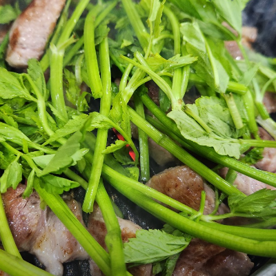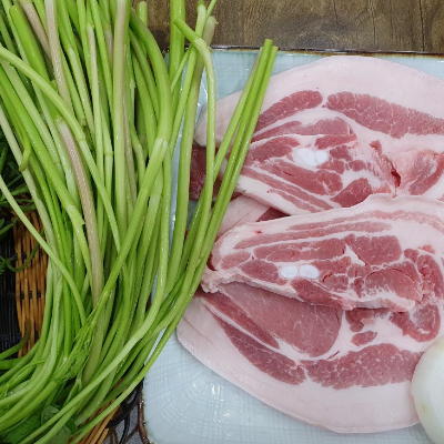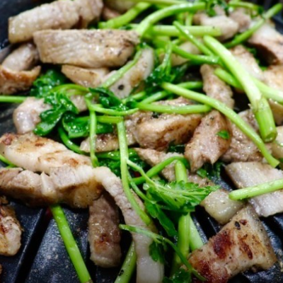 미나리와 흑돼지의 조합입니다. 신선하고 정말 맛있습니다.