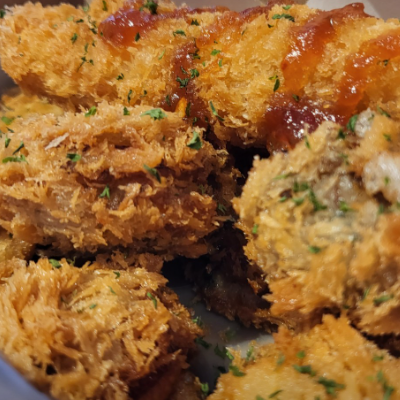 오카츠는 생선까스와 오징어순대의 조합 같은 맛이에요. 소스와 같이 먹어도 맛있어요.