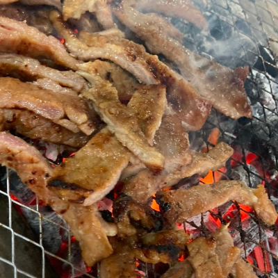 야외에서 먹는 고기맛이 아주 꿀맛입니다. 돼지갈비 맛이 좋습니다.