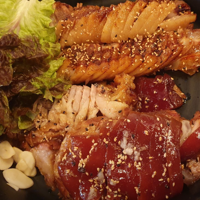 고기는 기름이 쫙 빠지고 푸석하지 않고 괜찮아요. 같이 주신 막국수는 자극적이지 않고 국물에 적셔 먹을수 있을 정도에요.