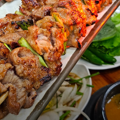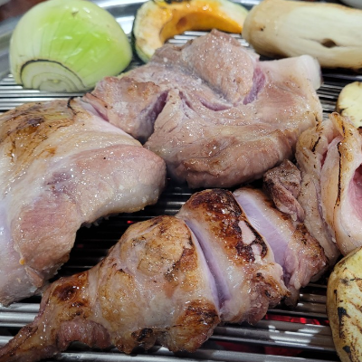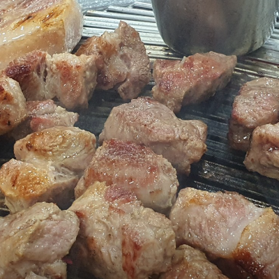 육즙 가득한 흑돼지 구이입니다. 꼬치에 초벌로 숯불에 구워오니 숯불향이 나서 넘 맛있어요.