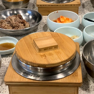 하양옥의 모든 솥밥 정식 주문시 솥뚜껑 된장찌개와 소고기가 제공됩니다.