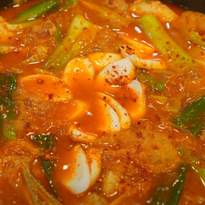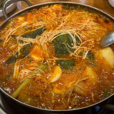 묵은지가 맛있고 떡, 감자가 들어갑니다. 다 먹을 때 라면 사리와 우동 사리 한번씩 추가해서 먹으면 좋습니다.
