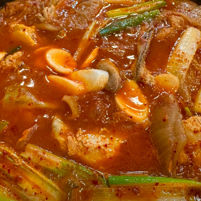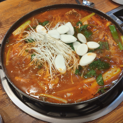 묵은지가 맛있고 떡, 감자가 들어갑니다. 다 먹을 때 라면 사리와 우동 사리 한번씩 추가해서 먹으면 좋습니다.
