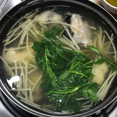 복지리탕 주문해 봤어요. 시원하고 맑은 국물에 미나리가 올려져 있고 아래는 복어 내장이랑 복어살, 콩나물이 들어가요.