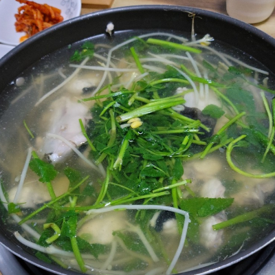 고춧가루와 참기름으로 무친 콩나물과 쫄깃한 복어 살을 함께 먹는 것이 좋습니다.