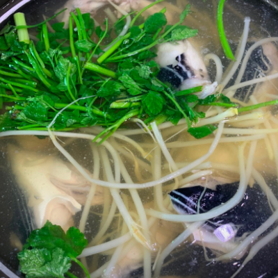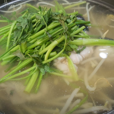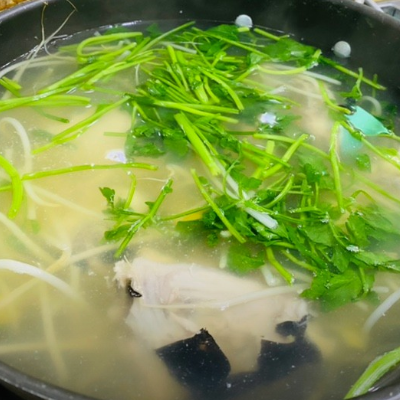 복지리탕 주문해 봤어요. 시원하고 맑은 국물에 미나리가 올려져 있고 아래는 복어 내장이랑 복어살, 콩나물이 들어가요.