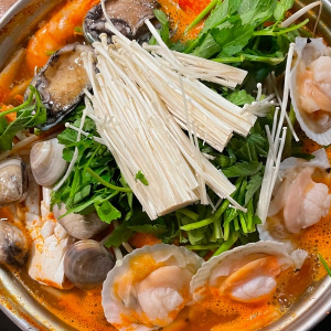 꽃게탕에는 전복이랑 가리비 꽃게가 들어있고 국물이 시원한 맛이예요.