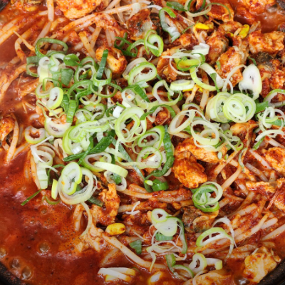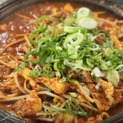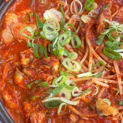 양념이 빨간데 별로 안매워요. 고기랑 소라랑 식감이 달라서 너무 좋고 콩나물 아삭아삭하니 별미입니다.