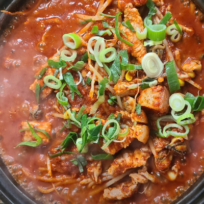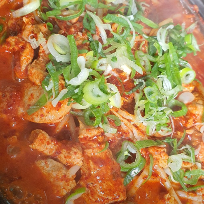 양념이 빨간데 별로 안매워요. 고기랑 소라랑 식감이 달라서 너무 좋고 콩나물 아삭아삭하니 별미입니다.