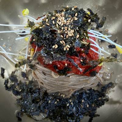 메밀싹 비빔막국수는 새콤매콤한 양념과 김의 양념이 무한 땡기는 맛 먹다가 육수 넣어서 먹으면 또다른 맛이 나요.
