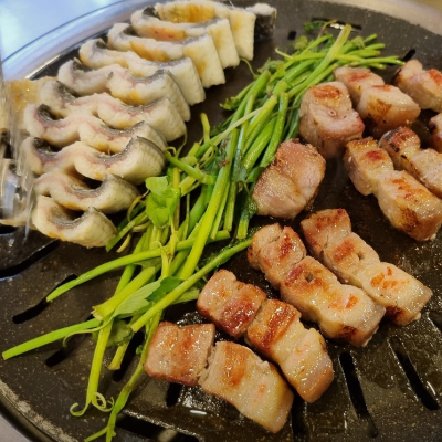 오리나 삼겹살 전혀 퍽퍽하지고 않고 육즙 짱입니다. 장어도 다른 곳 보다 저렴하고 큼직큼직합니다.