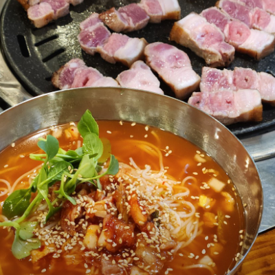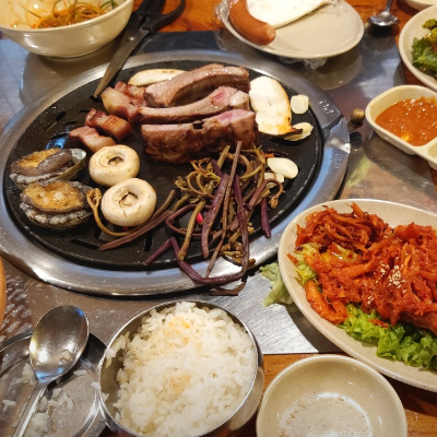 초벌을 한번 해서 나오는 고기라 빨리 익어서도 좋고 맛도 좋아요. 반찬류도 맛있고 멸치국수나 양푼 비빔밥도 최고예요