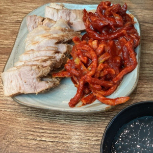 고기는 야들야들하고 명태회는 새콤매콤 아삭한 식감이 있어요.