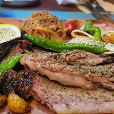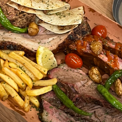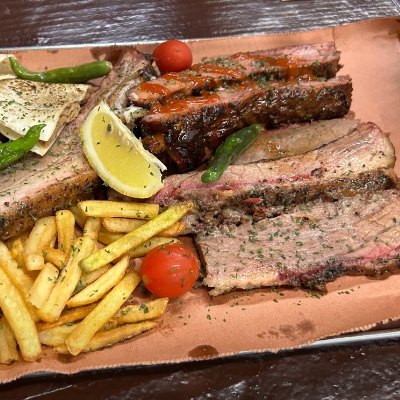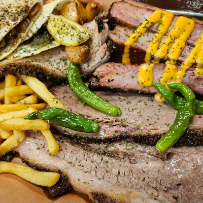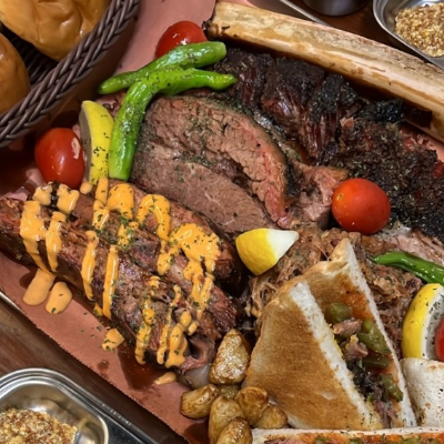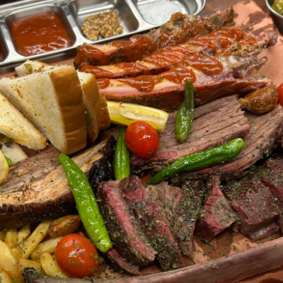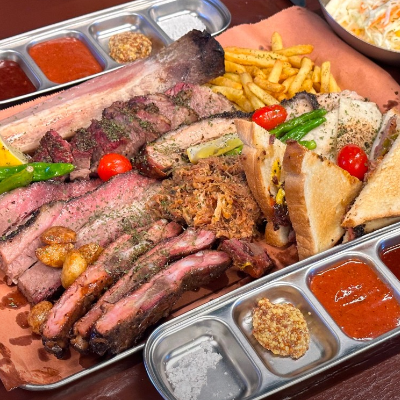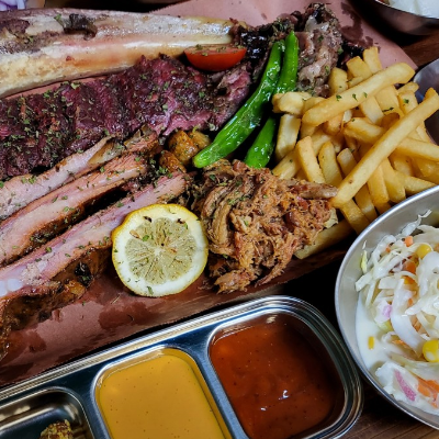 입구부터 너무 특색 있었어요. 3인 가족이라 4인 플래터 시켰습니다. 폴드포크, 비프립,브리스킷, 스페어립 골고루 나와요.