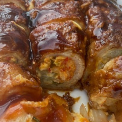 삼겹살김치말이는 살짝 자극적인 맛일수 있는데 삼겹살에 아삭아삭한 김치와 소스의 조합이 좋습니다.