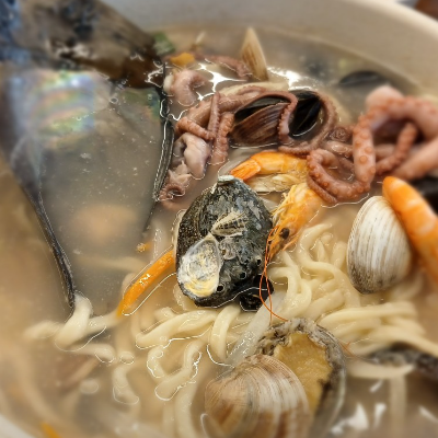조개 잔뜩, 통오징어 가리비까지 들어있고 아기랑 먹을거라 안맵게 해달라고 했는데 안 맵게 해도 시원한 바다맛이 나요.