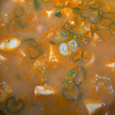 순두부는 시중에 파는 찰랑찰방 쉽게 으깨지는 두부가 아닌 직접 만든 꽤 단단한 순두부로 끓이는 것 같아요.