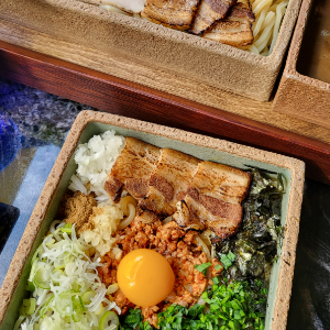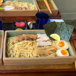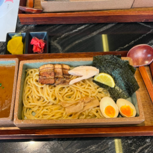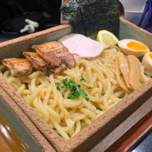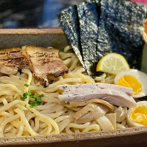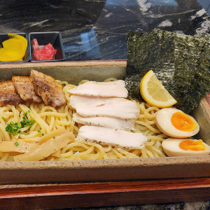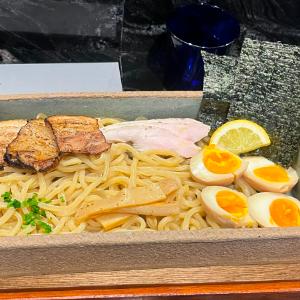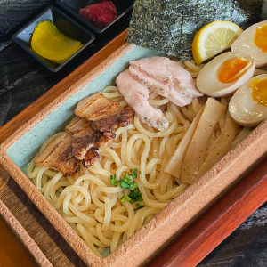 고소하고 진한 미소스프에 찍어먹는 츠케멘 토핑은 삼겹차슈, 닭차슈, 멘마, 타마고, 김, 레몬으로 만들어졌습니다.