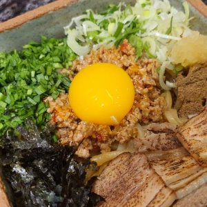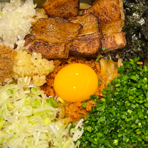 특제민찌와 차슈, 노른자, 야채등 다양한 토핑을 비벼먹는 마제소바입니다.