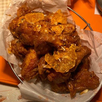 치킨이랑 사이드로 시킨 떡볶이 궁합이 좋았고 치킨 위에 감귤칩이 올라가 있는데 조합이 잘 어울리고 맛도 좋아요.