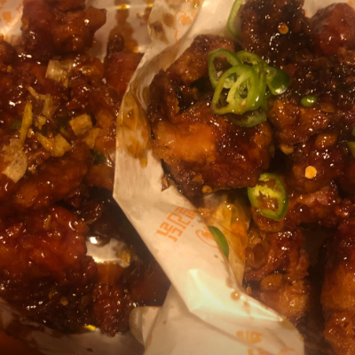 치킨이랑 사이드로 시킨 떡볶이 궁합이 좋았고 치킨 위에 감귤칩이 올라가 있는데 조합이 잘 어울리고 맛도 좋아요.
