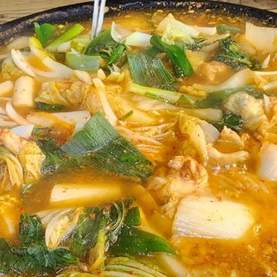 칼칼한국물에 우동,고구마,떡 사리넣어 살짝 조려먹는 매콤한 국물이 매력적인 물닭갈비입니다.