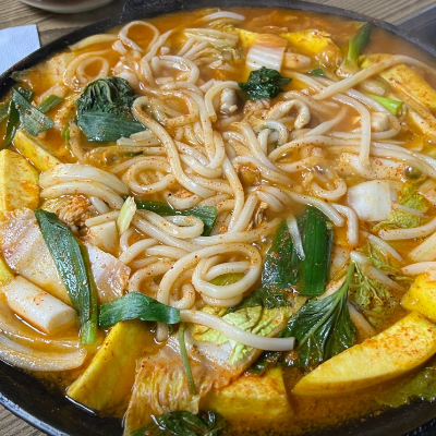 칼칼한국물에 우동,고구마,떡 사리넣어 살짝 조려먹는 매콤한 국물이 매력적인 물닭갈비입니다.