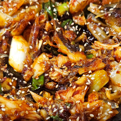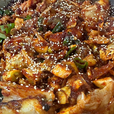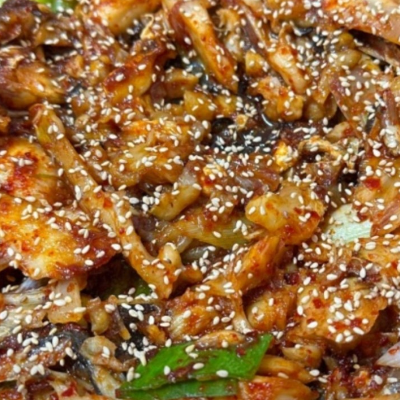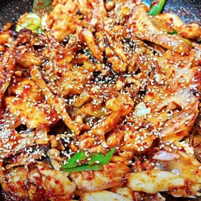 빨간색의 비법양념이 맵지 않고 살짝 달짝한 맛이 나서 같이 들어간 양파도 양념이 배어서 맛있습니다.