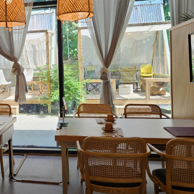 반찬 하나하나 다 깔끔하고 요리에 정성이 느껴졌어요. 외부에 커피 마시는 캠핑형 방갈로도 넘 멋지고 이색적이였습니다.