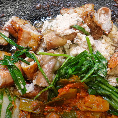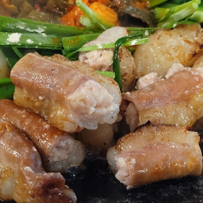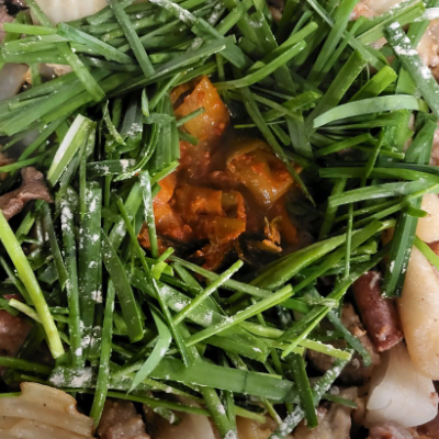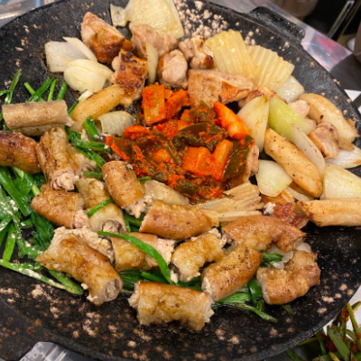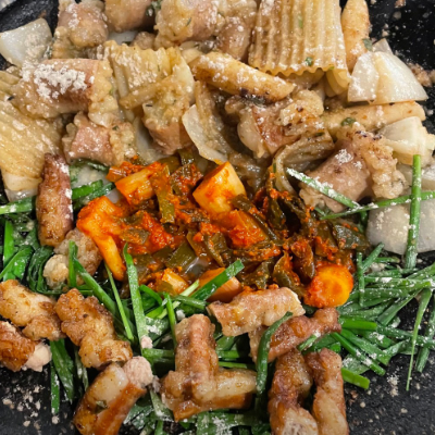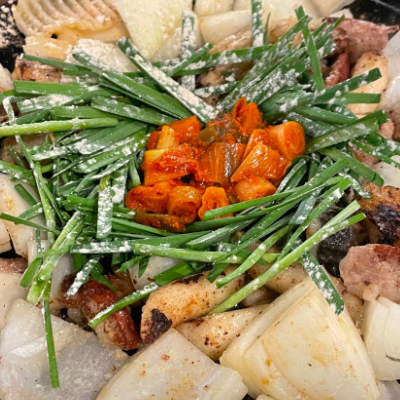부추랑 대파무침 같이 구워서 먹으면 맛이 좋고 무생채볶음밥 살짝 달짝지근하면서 돌솥에 밥 눌러서 먹으면 K디저트로 너무 좋아요.