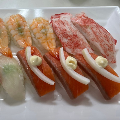 그냥 흰접시에 초밥 2인분 양을 올려주시는데요 종류는 초새우, 유부, 연어, 게살, 광어 이렇게 있었습니다.