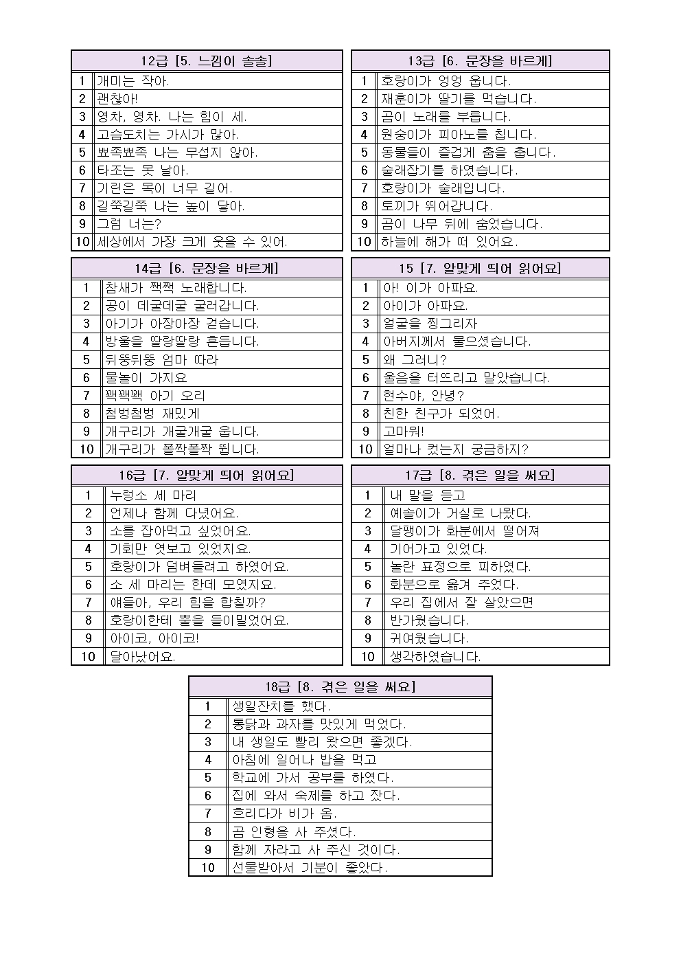 초등 1학년 받아쓰기 급수표 다운로드 자료