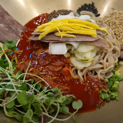 오늘에야 맛을 보고 왔어요. 흑임자비빔메밀국수를 시켰는데 들깨와 흑임자 그리고 메밀과 고기 양념의 조합이 좋았어요.