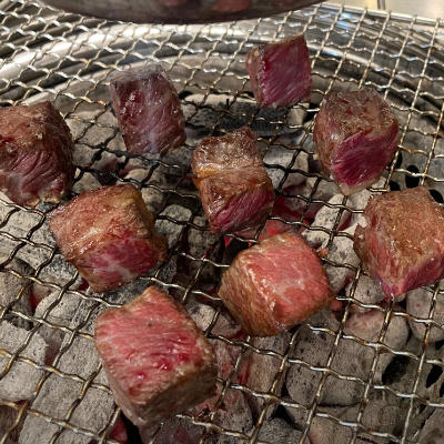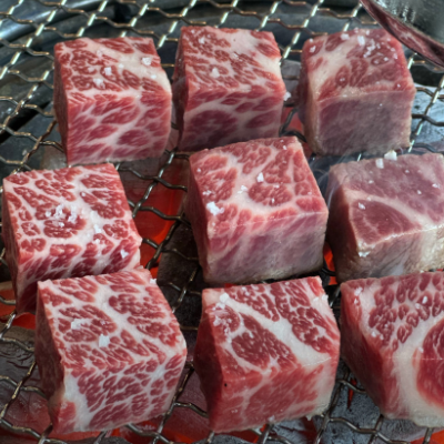 깍뚝꽃살은 마블링 장난 아니고 깍두기 모양입니다. 숯불에서 이리저리 굴리면서 구워주면 육즙이 안에 가득하고 맛있어요.