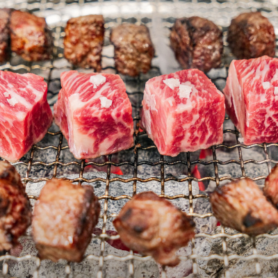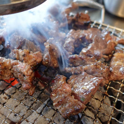 깍뚝꽃살은 마블링 장난 아니고 깍두기 모양입니다. 숯불에서 이리저리 굴리면서 구워주면 육즙이 안에 가득하고 맛있어요.