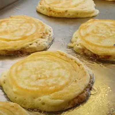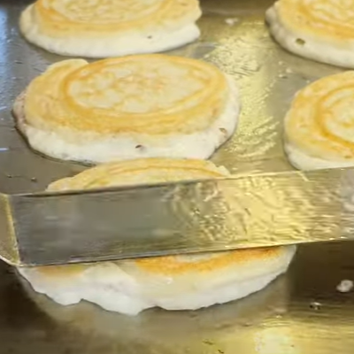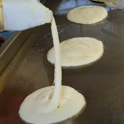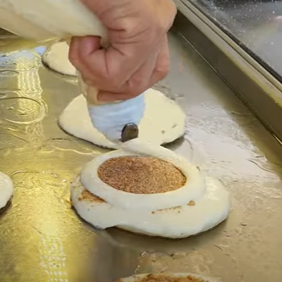 달인의 호떡은 반죽을 철판에 동그랗게 부운뒤 위에 설탕소를 뿌리고 다시 반죽을 동그랗게 부어주는 방식으로 만들고 있습니다.