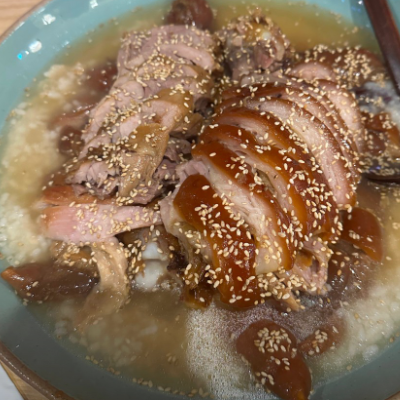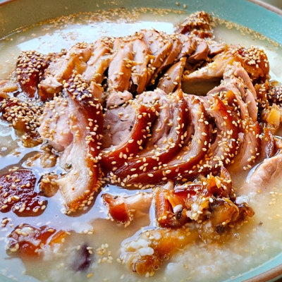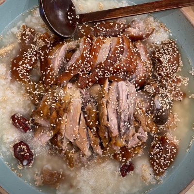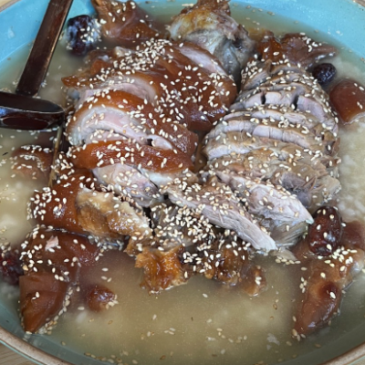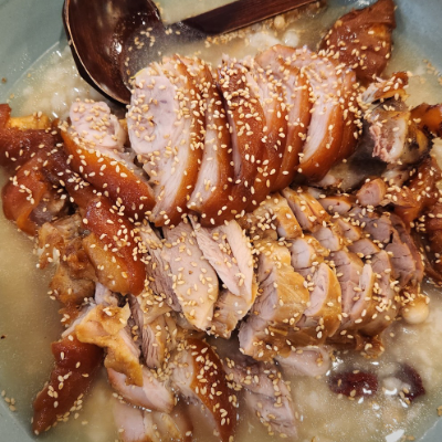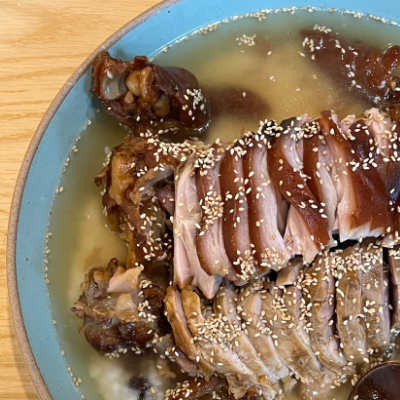 살코기는 부드럽고 겉은 쫀득쫀득한 족발을 먹고 나면 아래에 걸쭉한 죽이 나와 하나의 완성된 요리를 보여주었어요.